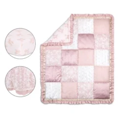 The Grace 4-Piece Crib Set by The Peanutshell is a collection that brings together every nursery essential. The set includes an elegant patchwork quilt, bow print fitted sheet, changing pad cover and a layered dust ruffle. The quilt showcases a pretty patchwork of fabrics in dusty pinks with a golden trim. Each square has a unique feel with an embroidered dot, moire taffeta, crinkle satin and a sweet overlay with a ribbon textured floral pattern. The dust ruffle is a double layer of rich fabrics with a sheer netting resting atop a panel of moire taffeta. The netting has delicate motifs created by tulle ribbons and crewel-work inspired embroidery to create a soft floral design. The collection features rich, dusty pinks in an assortment of luxe fabrics — cotton sateen, moire taffeta and crinkled and embroidered satin. The perfect sweet and sophisticated start for any baby girl’s nursery.